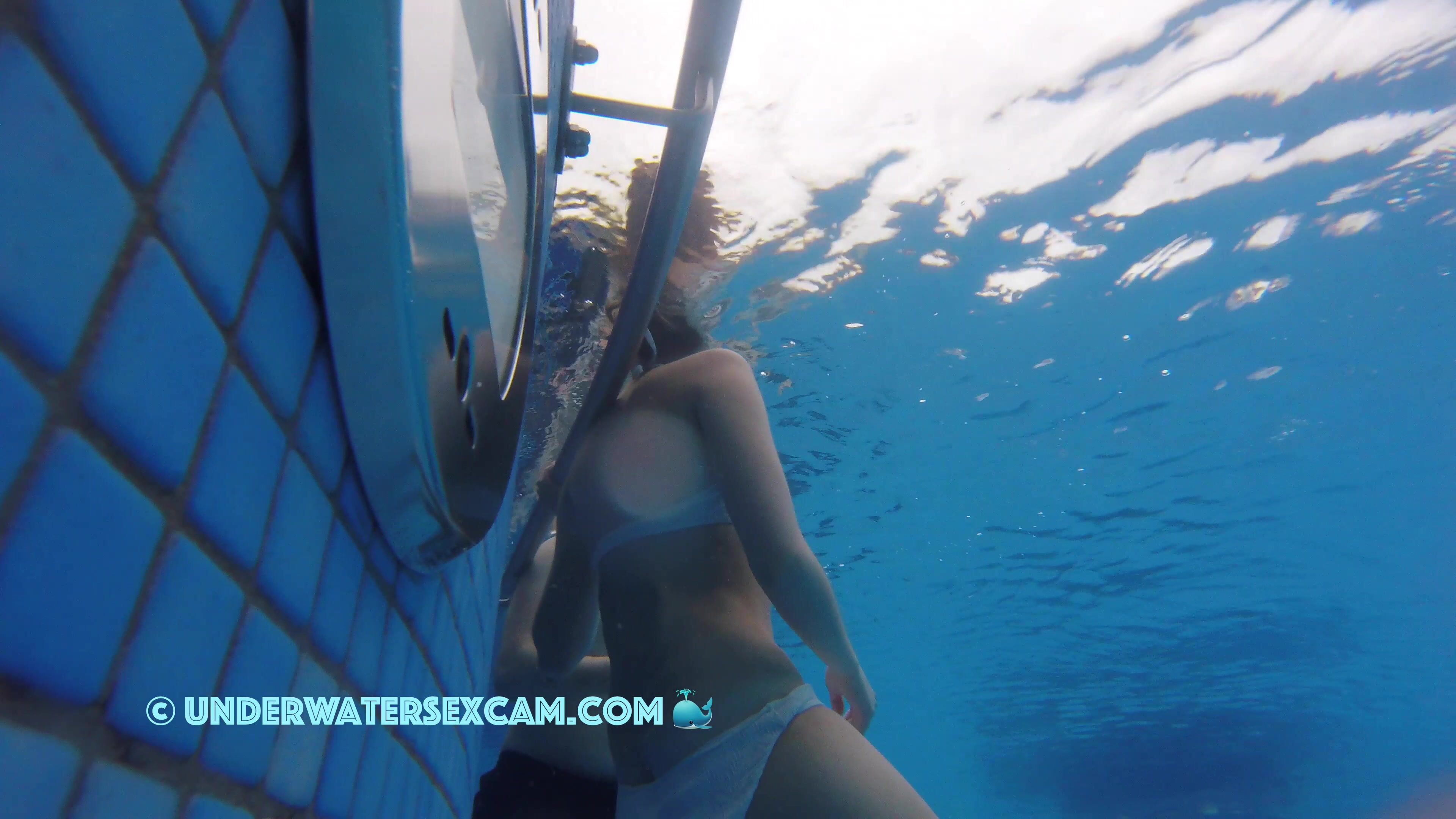 She almost loses her bikini panties underwater in the public pool while the hidden camera is running.
