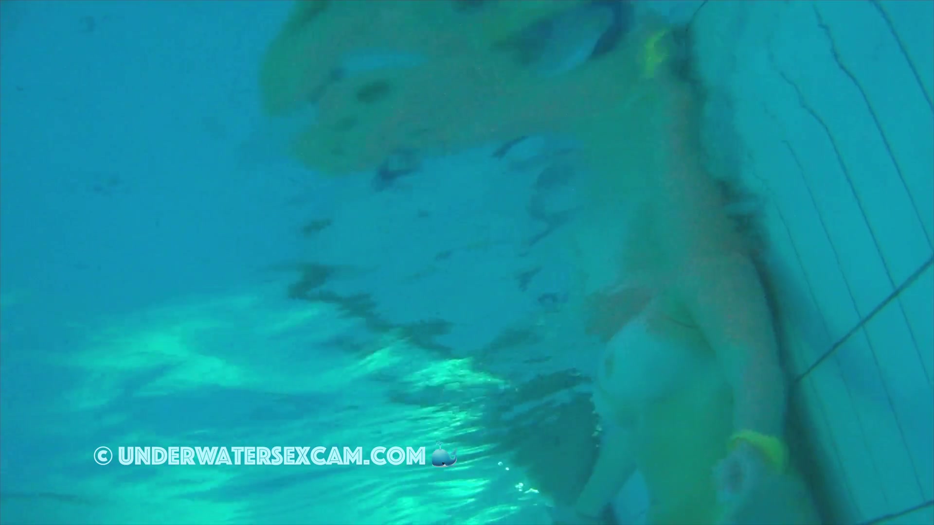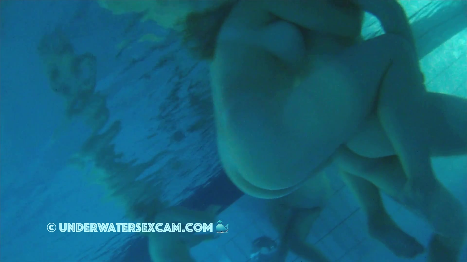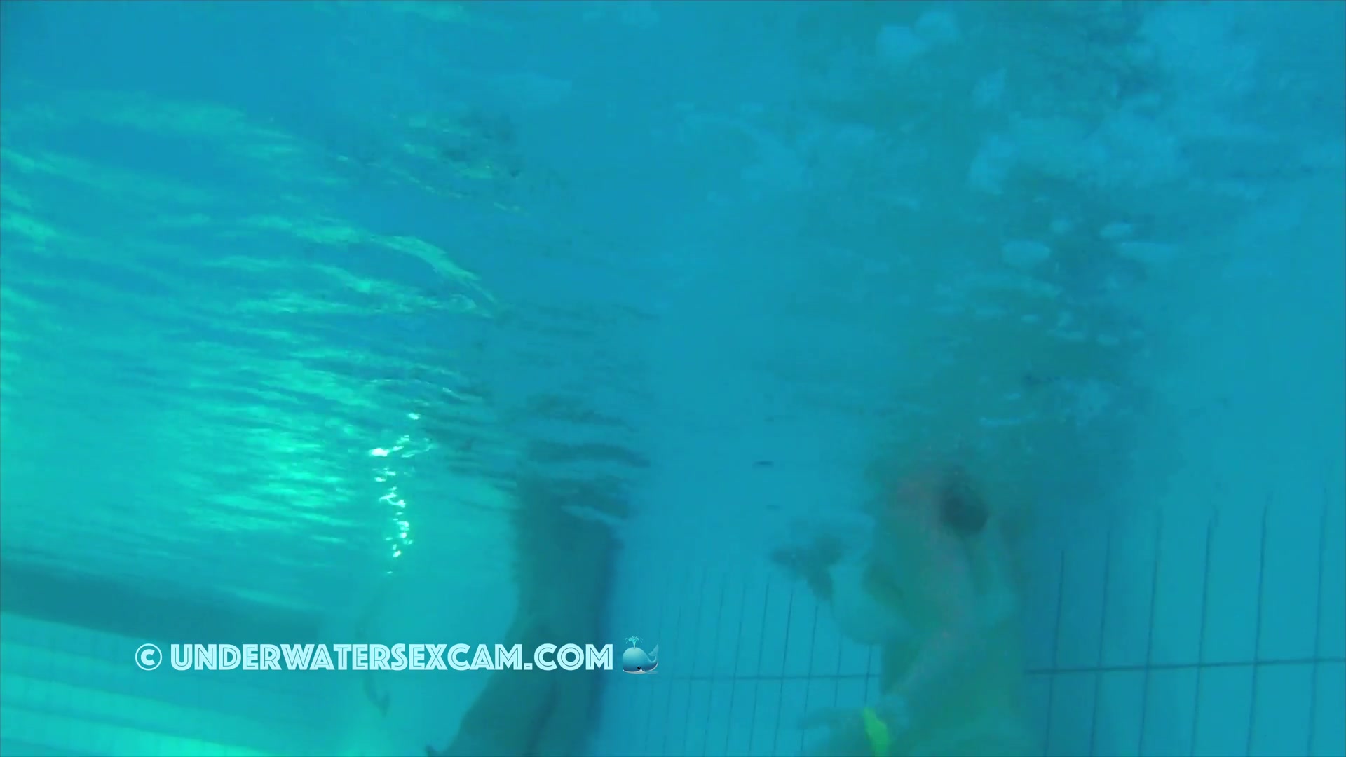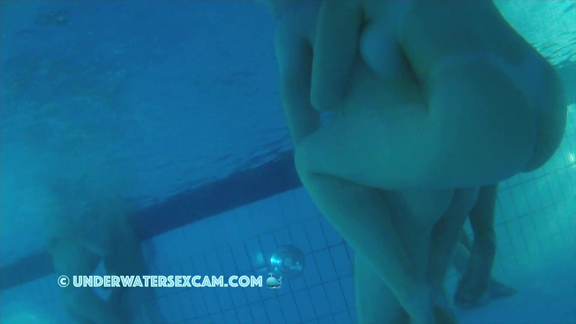 Big white girl with big tits and tan lines in a public pool in the evening while the voyeur is filming with his hidden underwater camera.