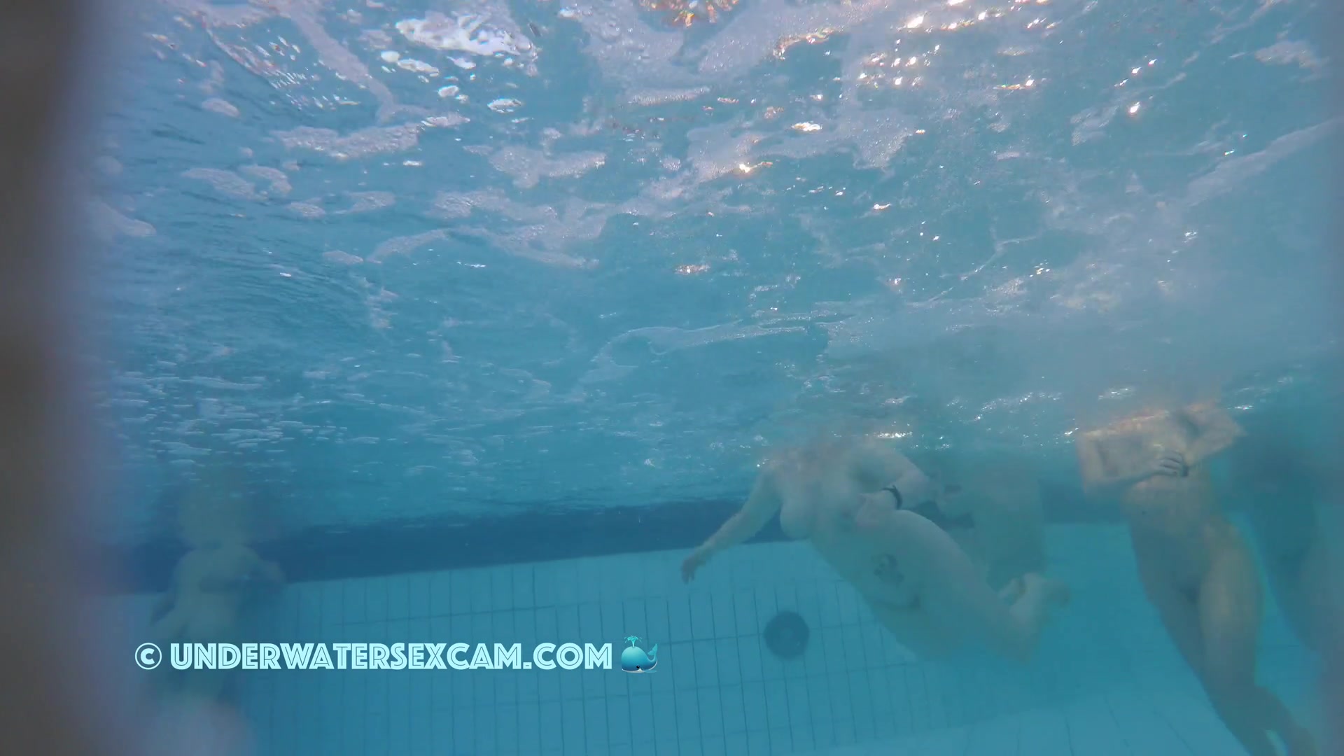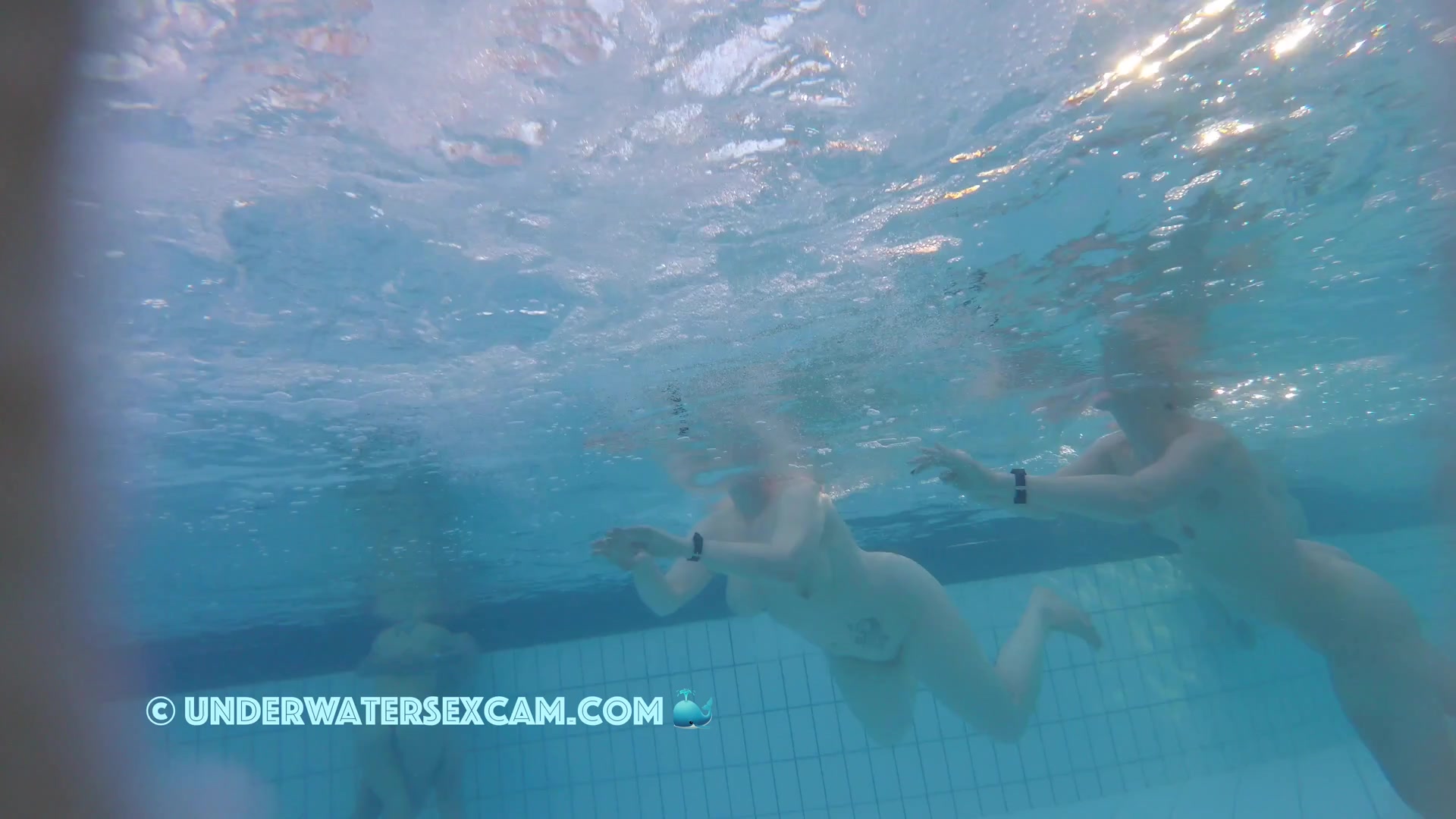 Two cute girls are swimming by in a public pool while the hidden underwater camera is running.