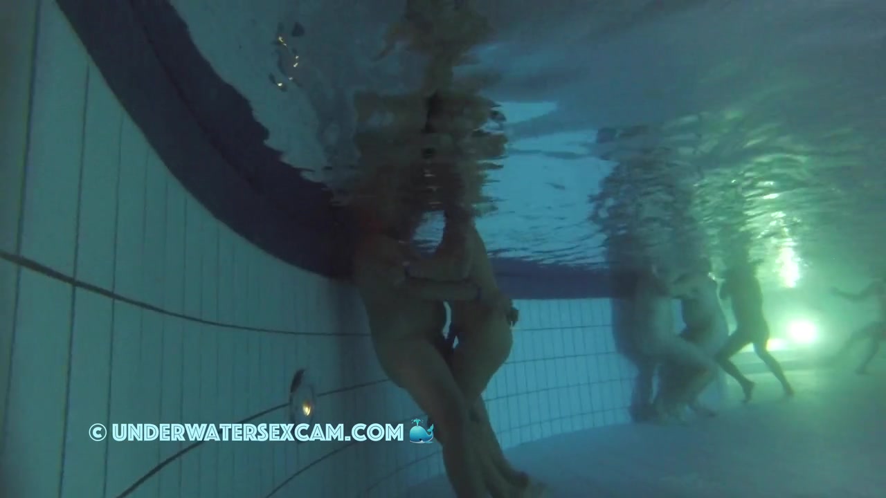 Husband love his nudist wife underwater in a public pool while the voyeur is shooting them with his hidden underwater camera.