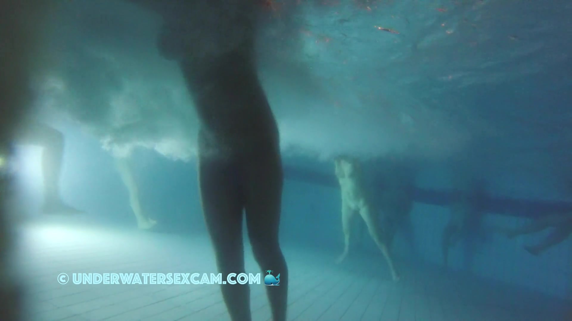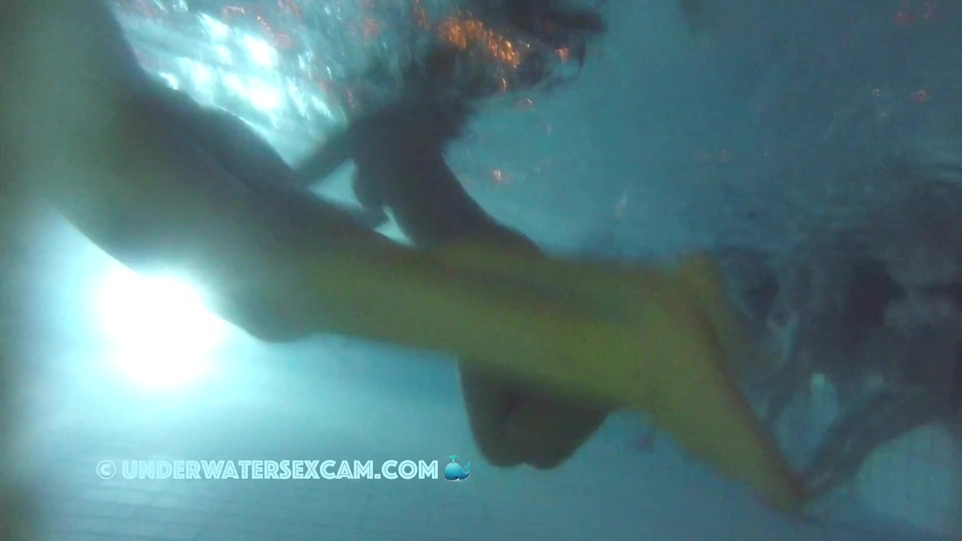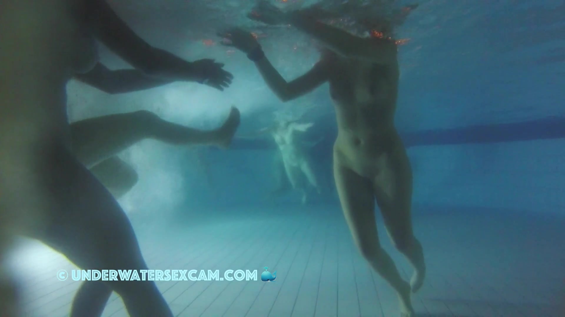 Hot black teen girl with very well shaved girlfriends in a public pool at night and the voyeur is filming with his hidden underwater camera.