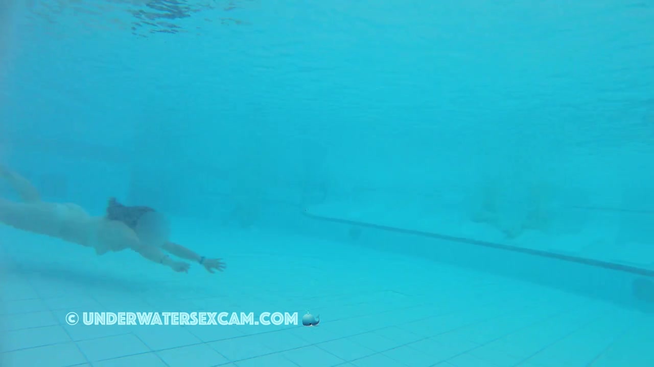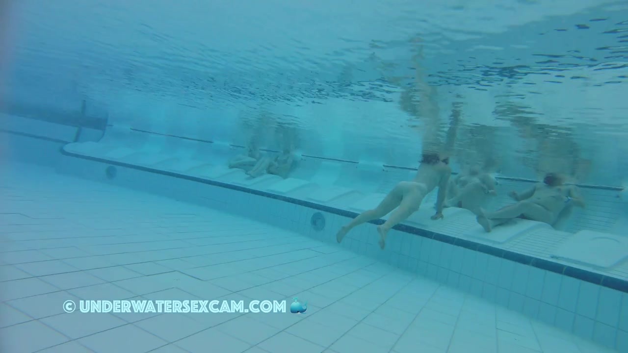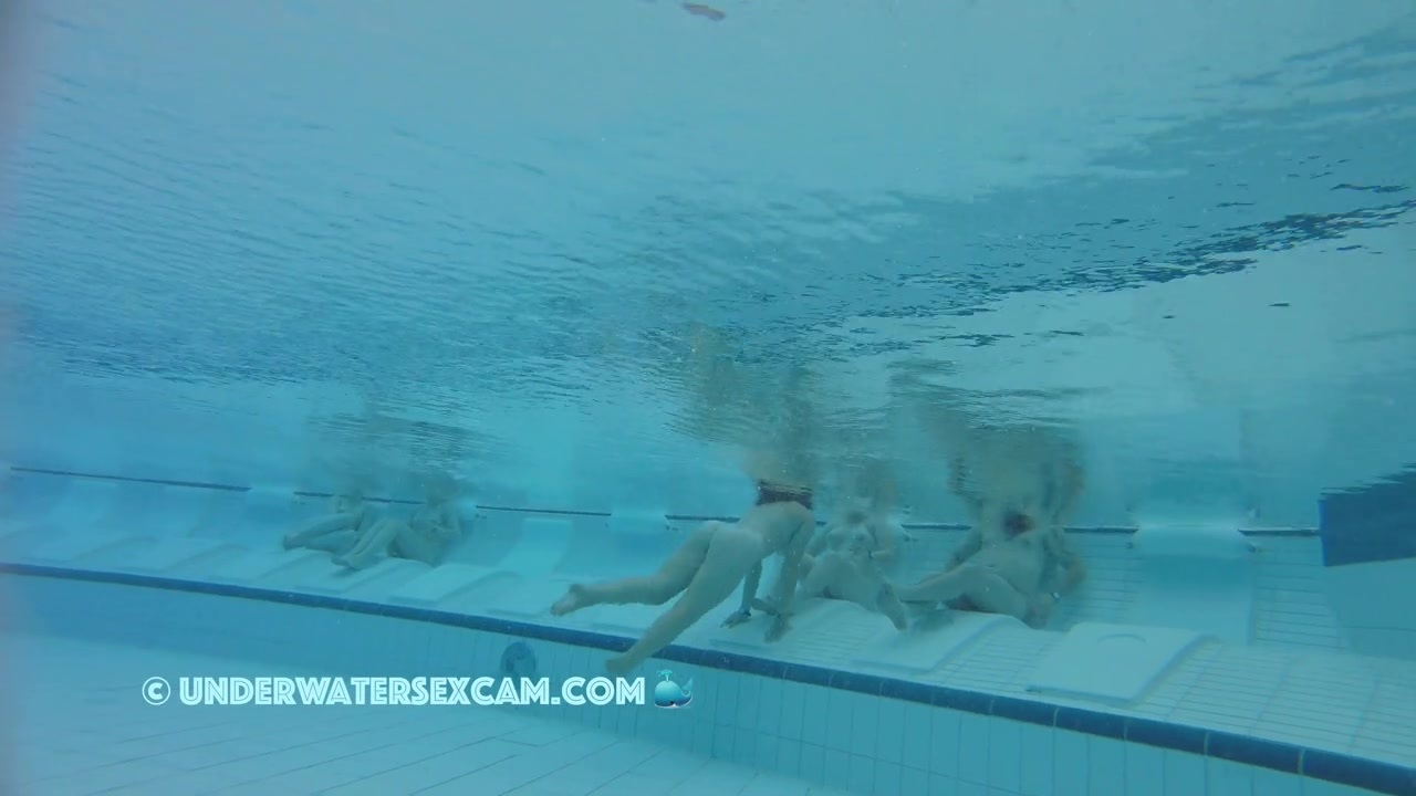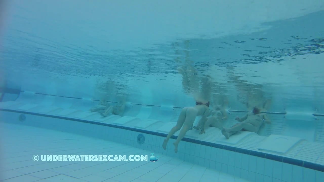 Naked girl swims by and visits naked friends in a public pool but the hidden security camera is filming them underwater.
