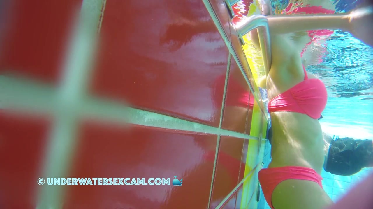 Busty girl in pink bikini loves underwater massage in a public pool while the voyeur is shooting her with his hidden camera.