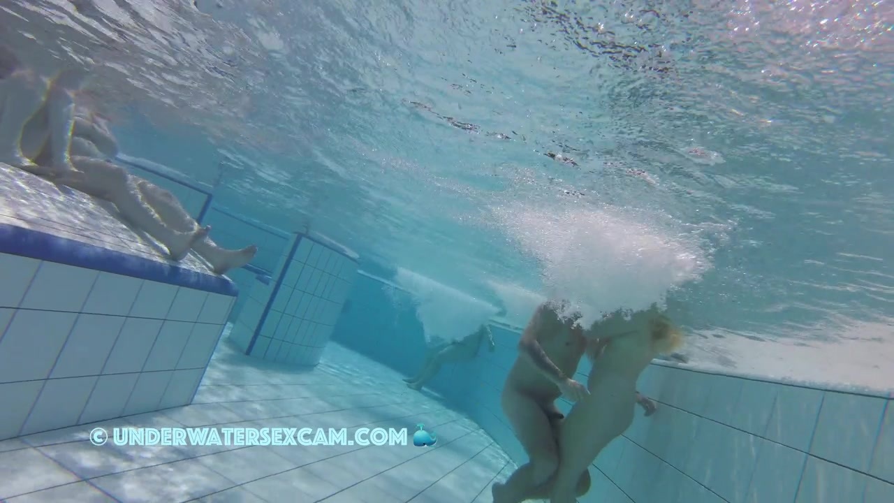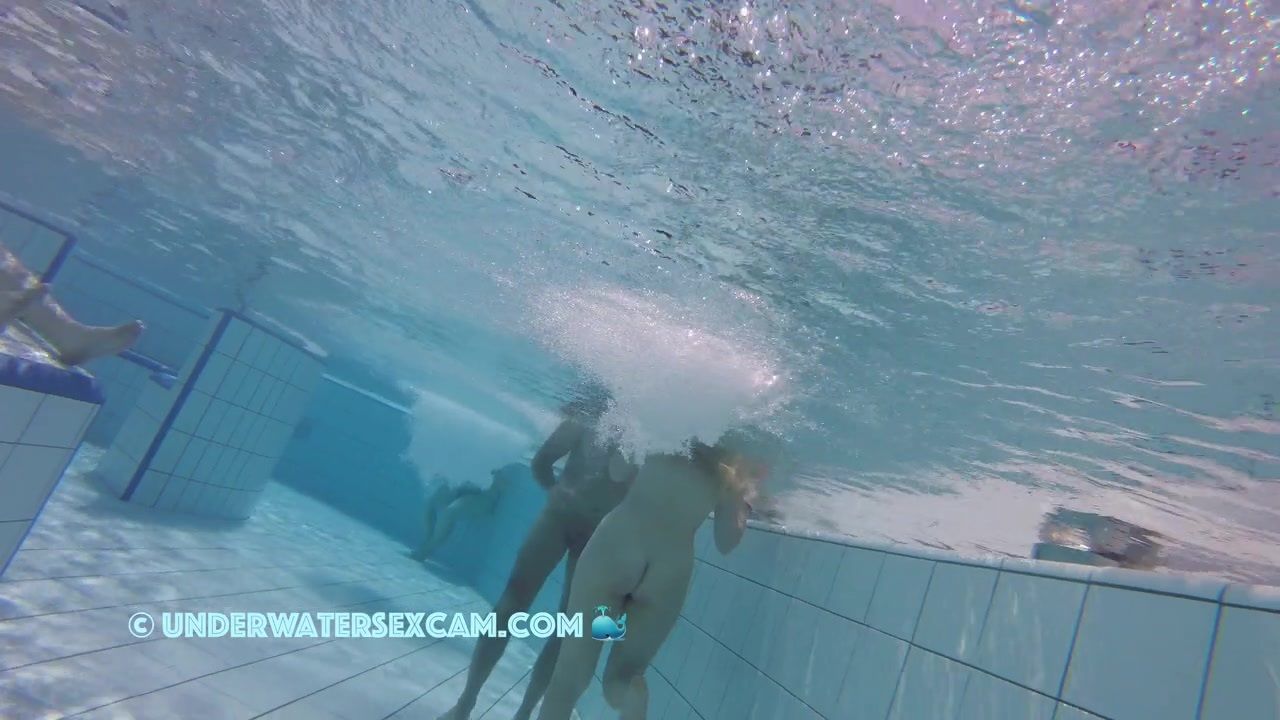Cute girl and her boyfriend in a nudist resort and the voyeur is filming them with his hidden underwater camera in the public pool.