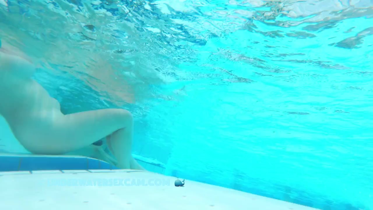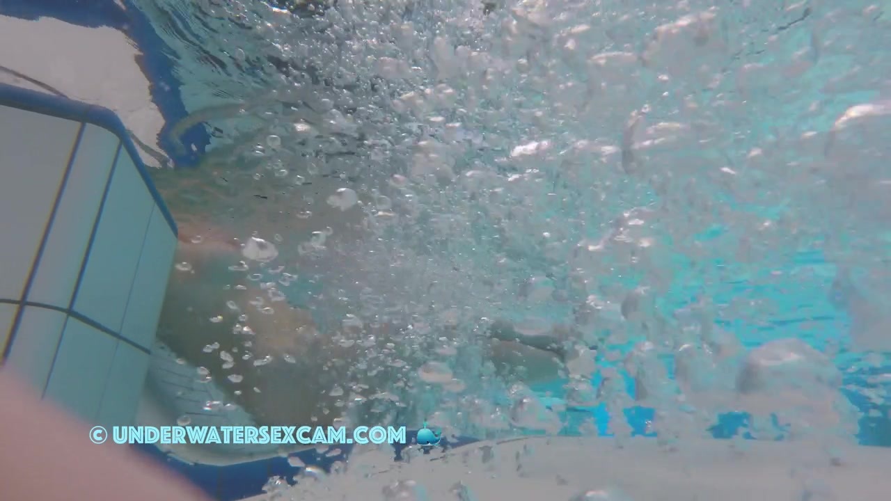 Busty young lady on an underwater bench in a public pool while the voyeur is filming her with his hidden underwater camera.