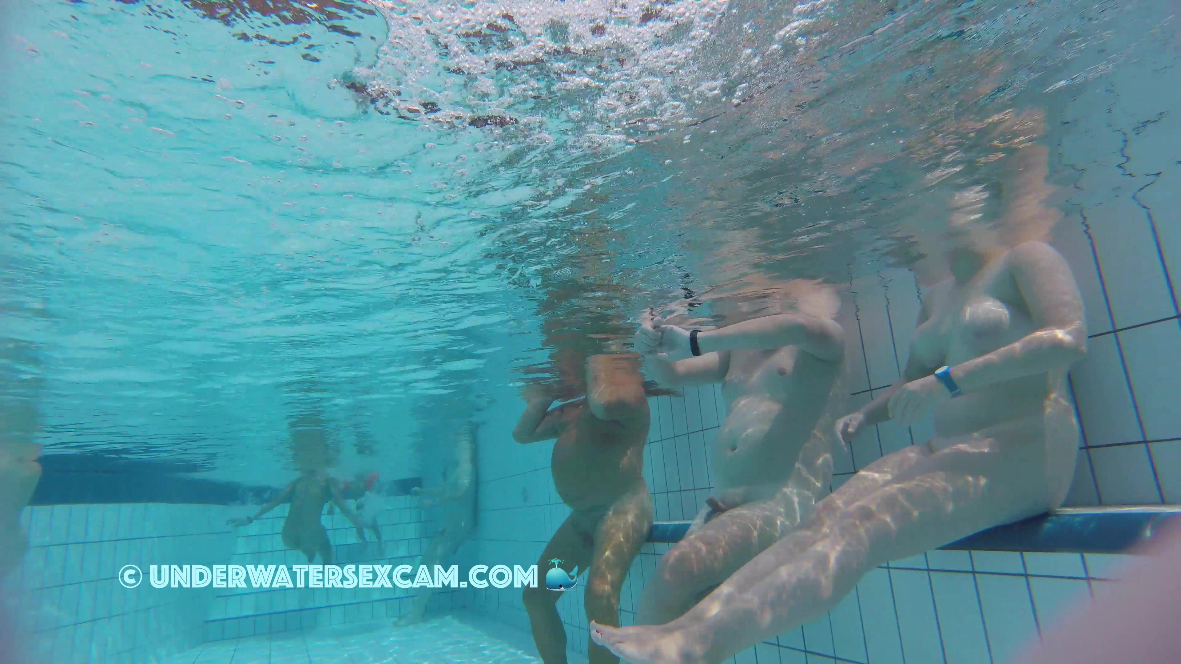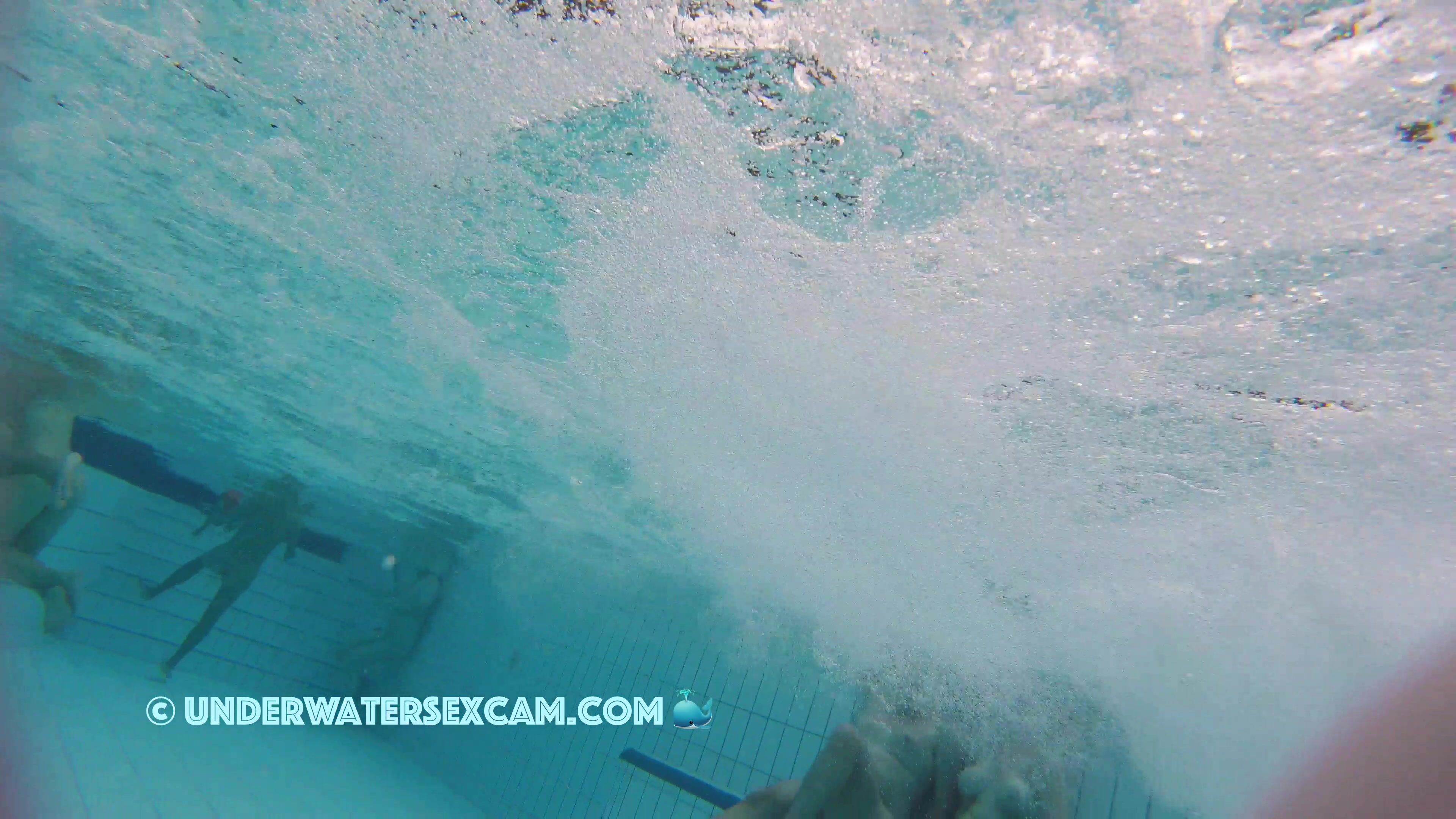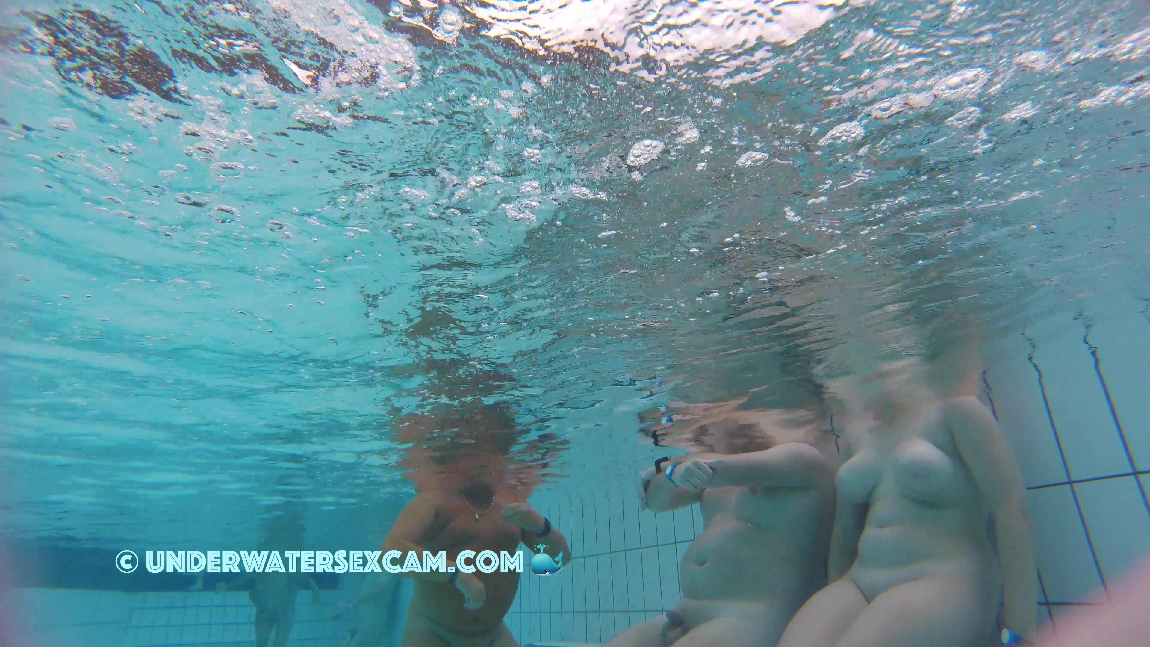 She has big white areolas and the voyeur is filming her with his hidden underwater camera in a public pool of a nudist resort.