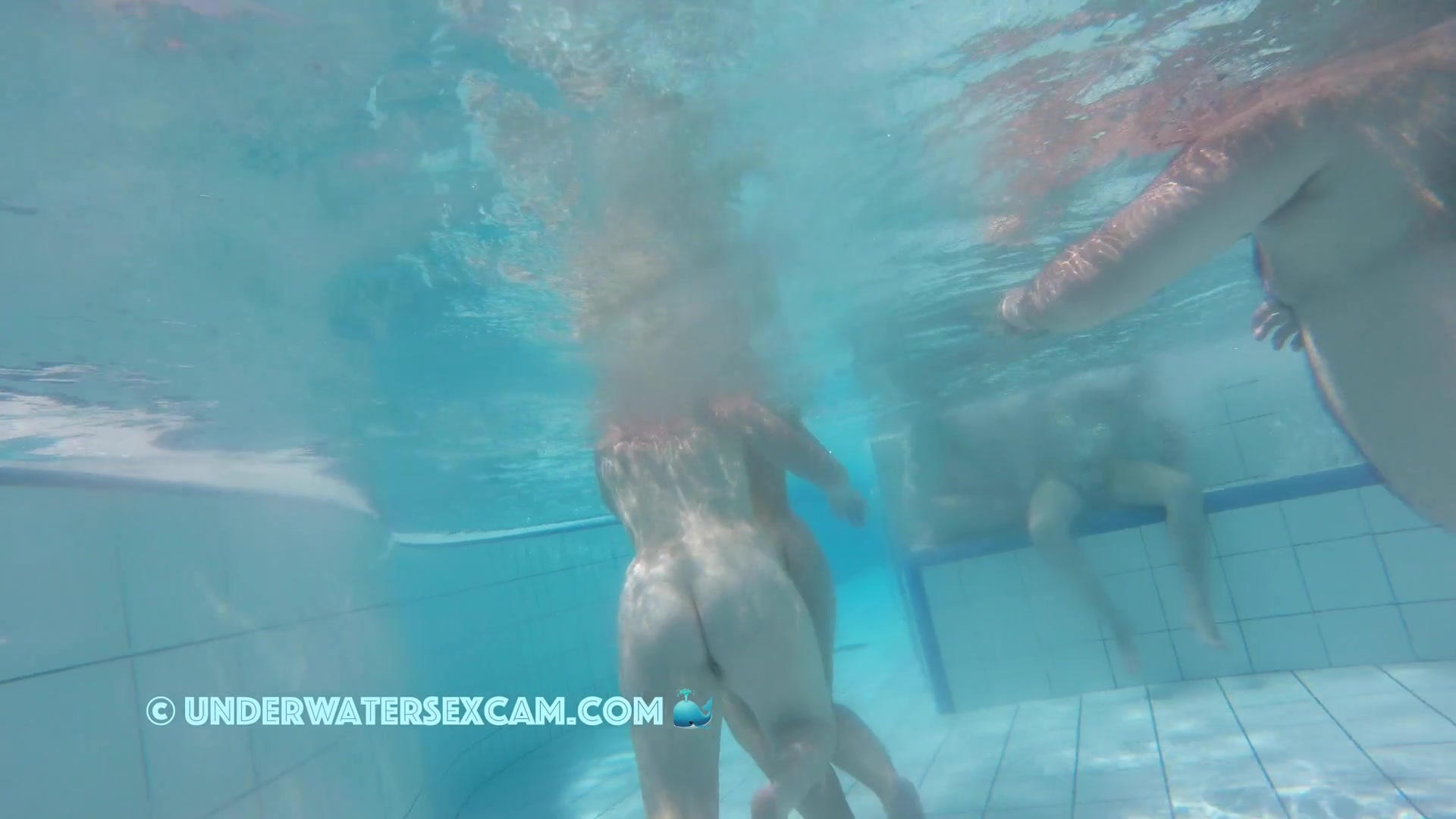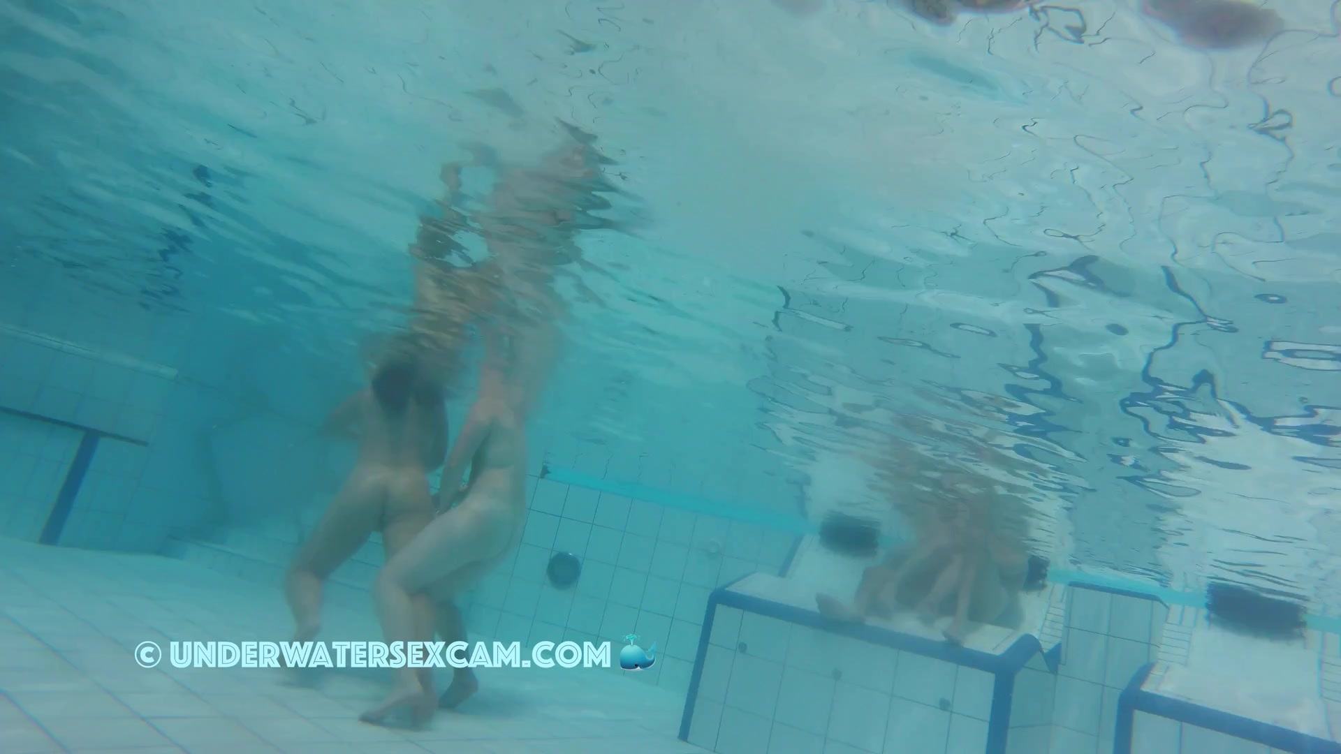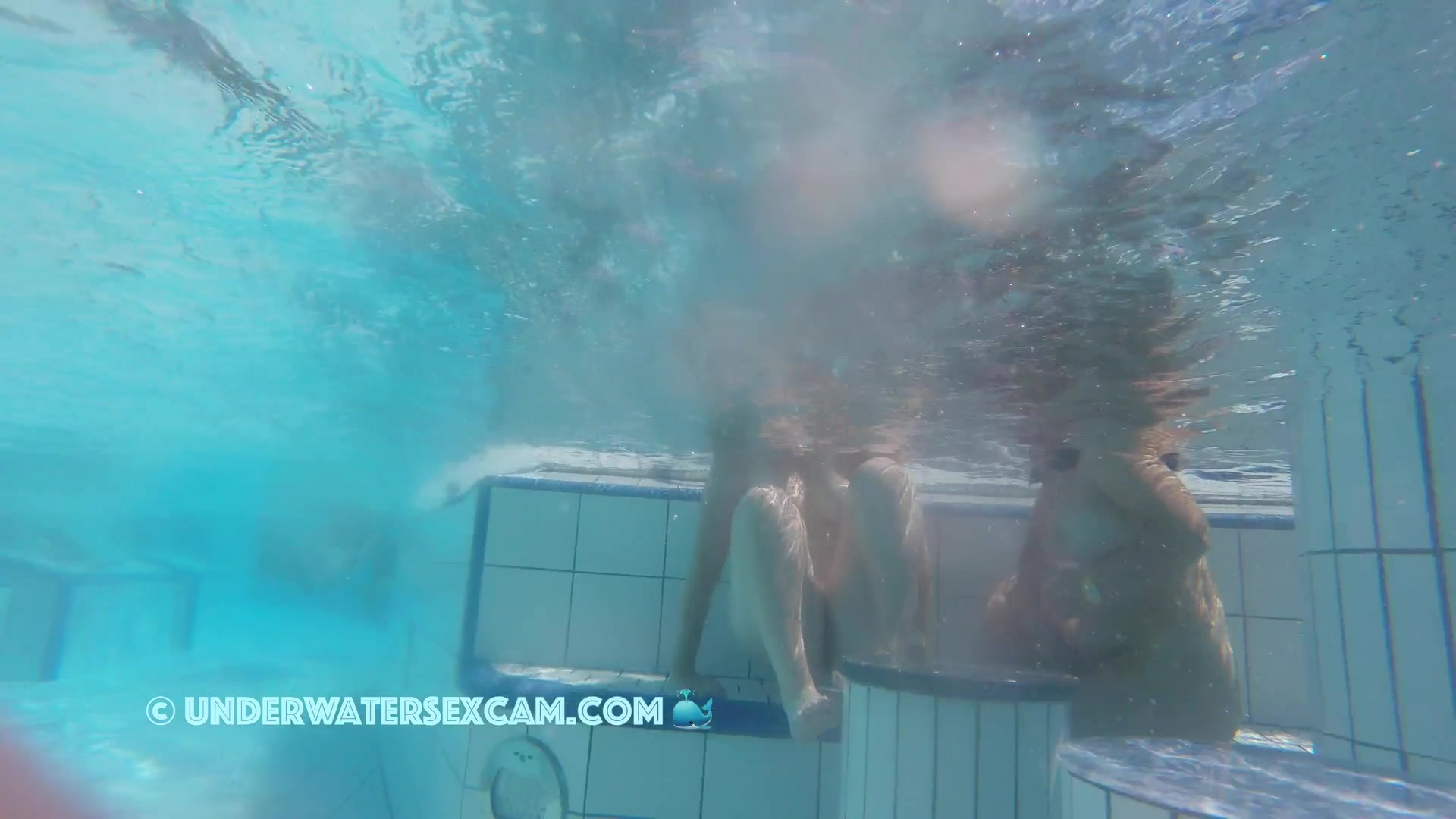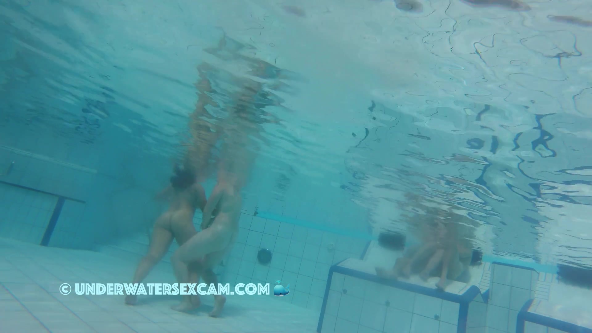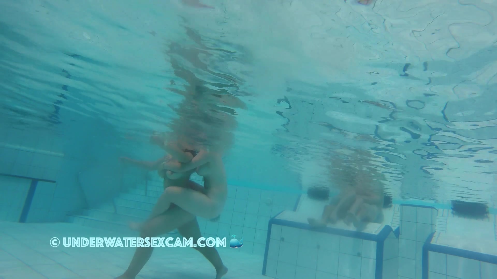 Cute lesbian teen couple shows their love underwater in a public pool while the voyeur is filming them with his hidden spy camera.