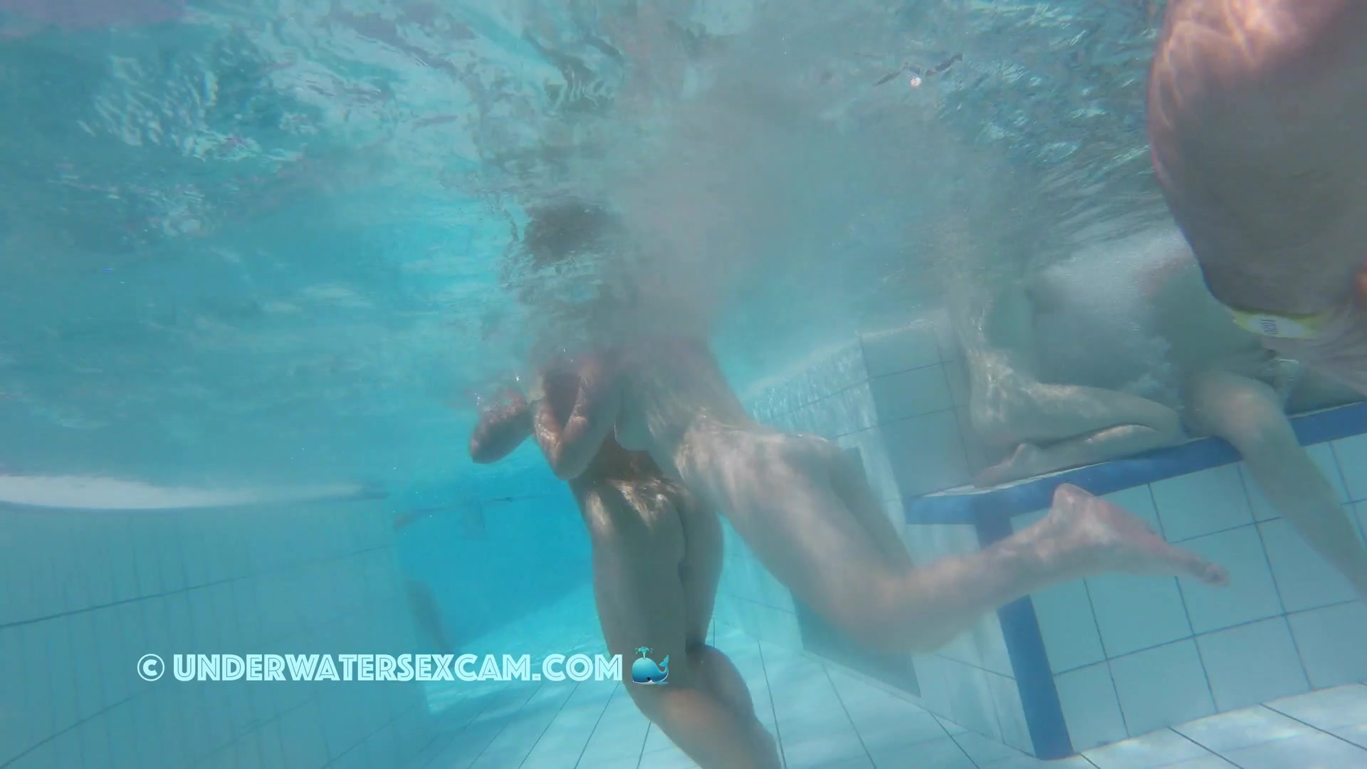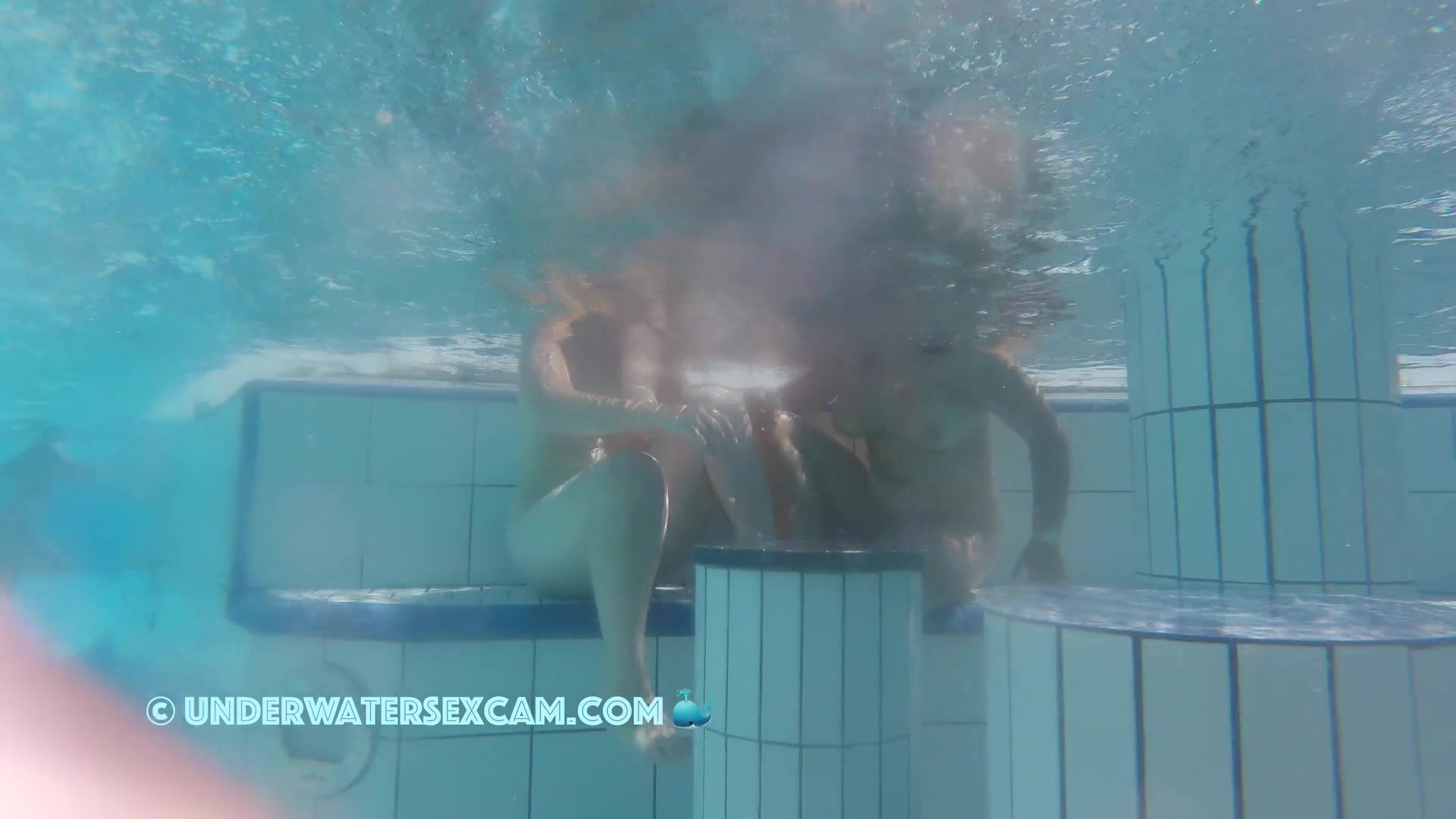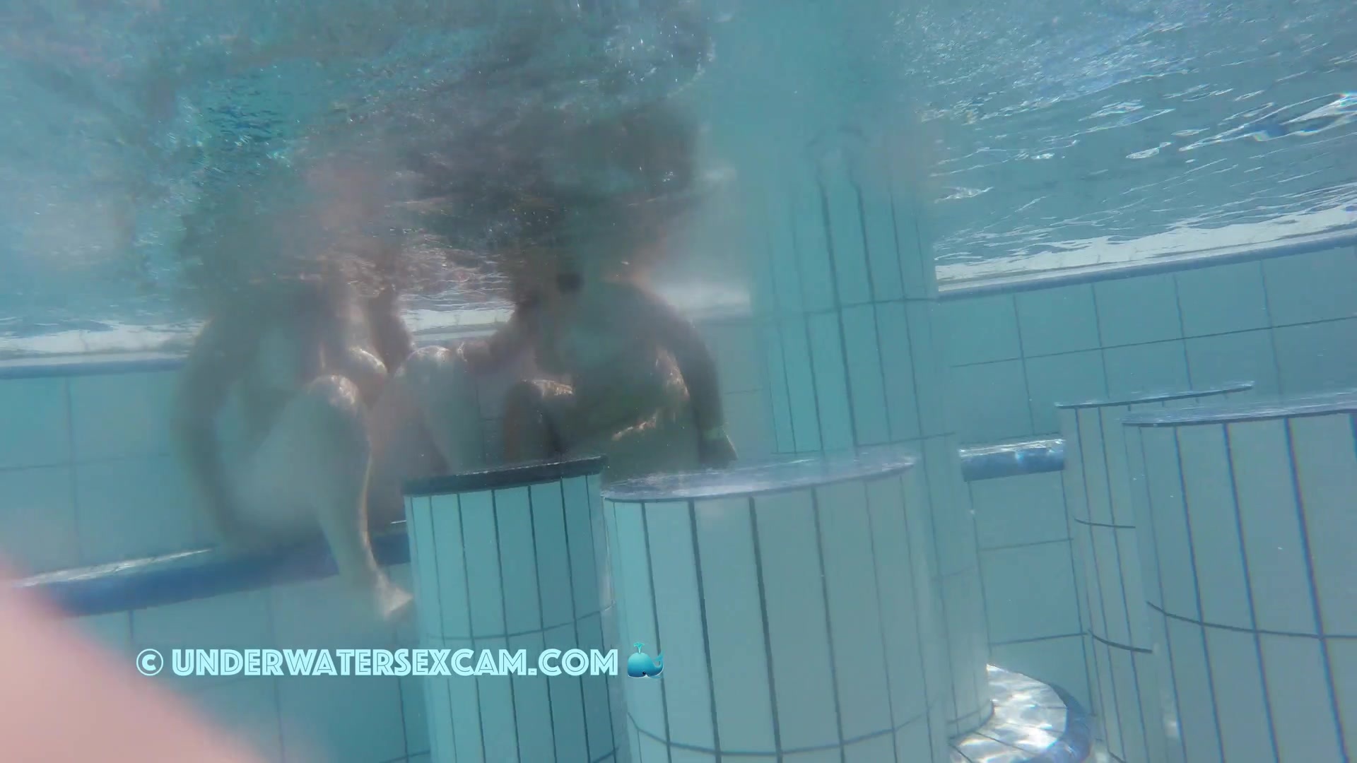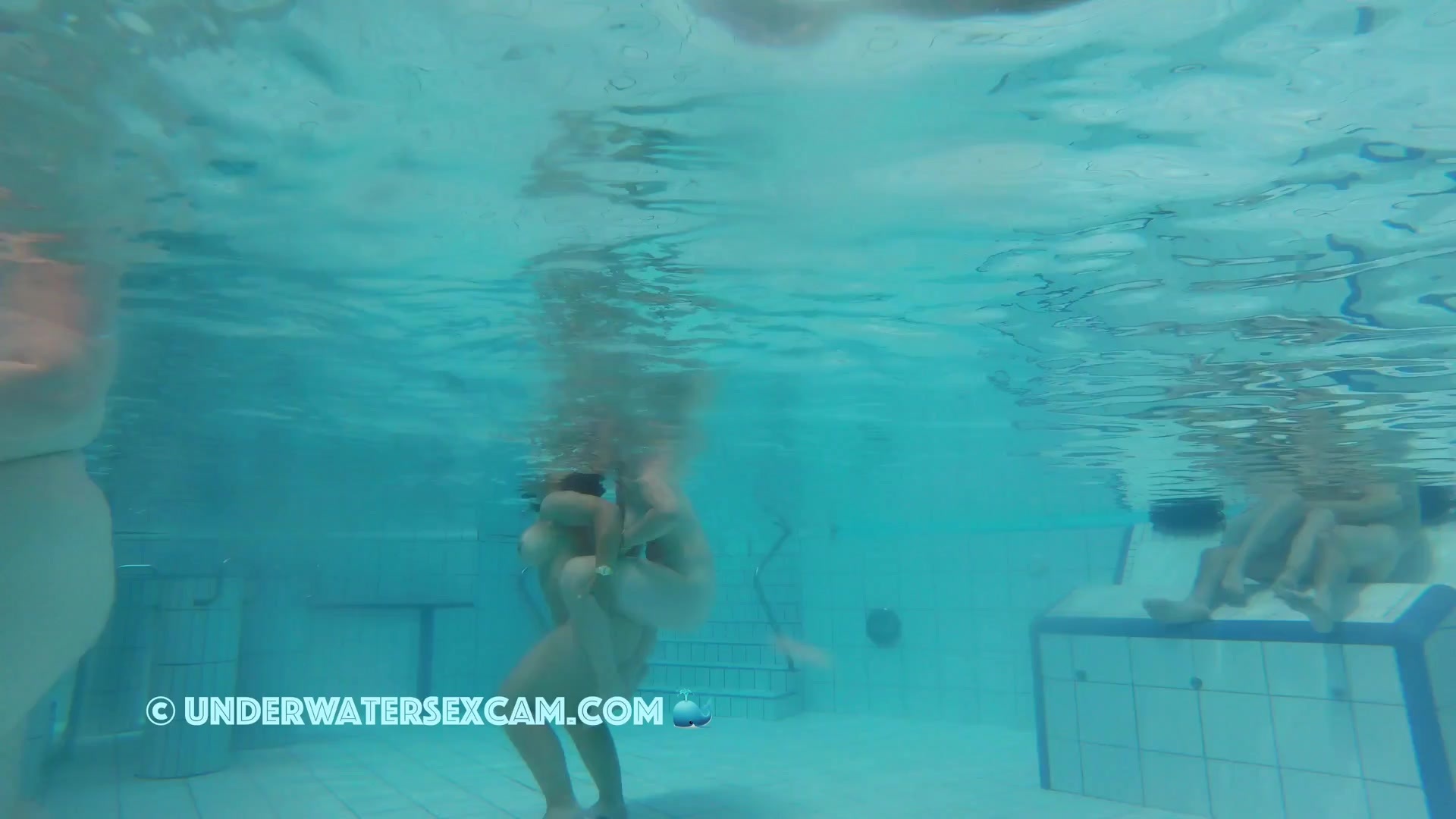 Cute lesbian teen couple shows their love underwater in a public pool while the voyeur is filming them with his hidden spy camera.