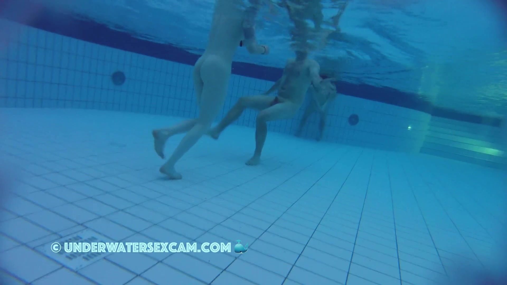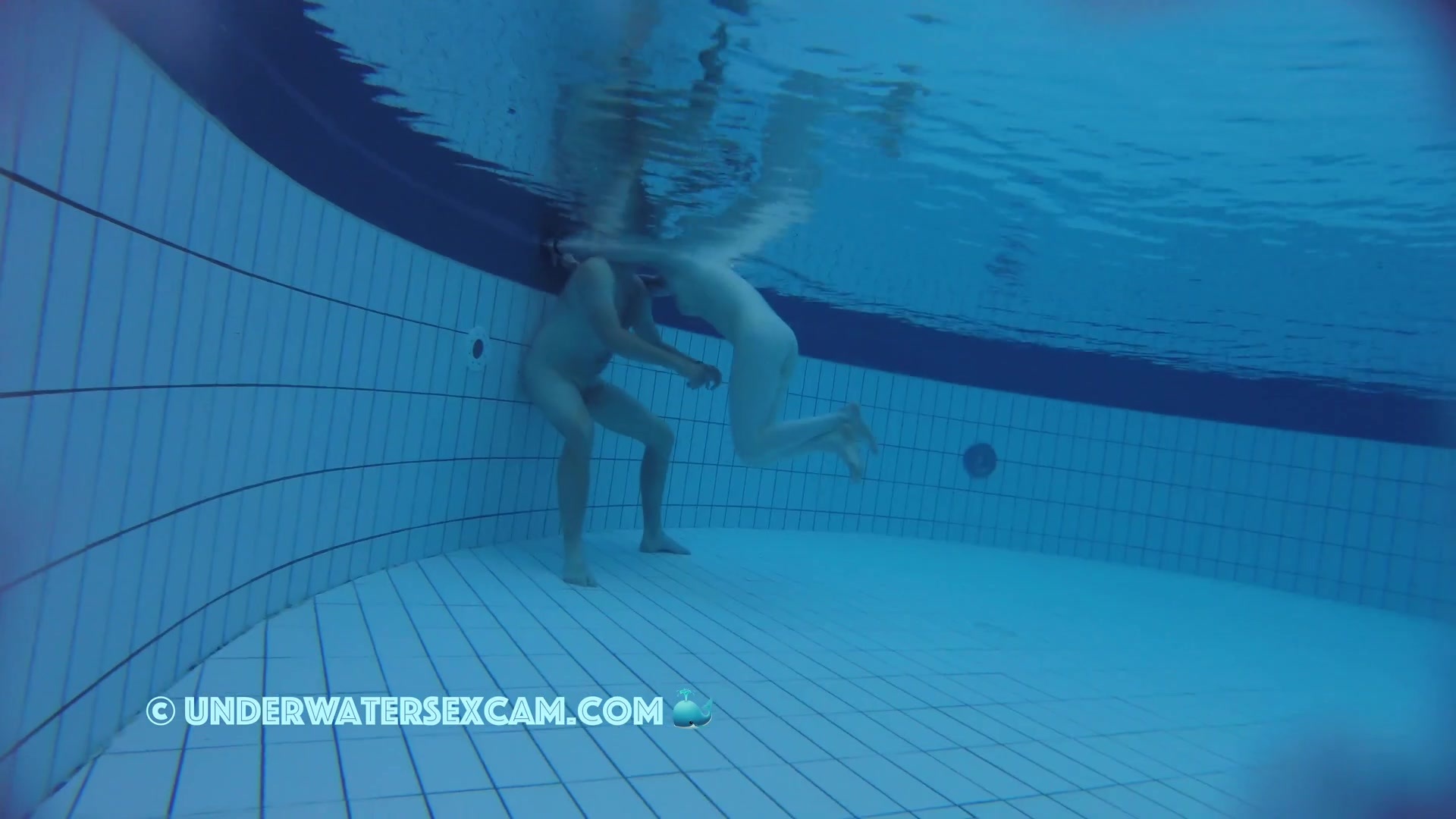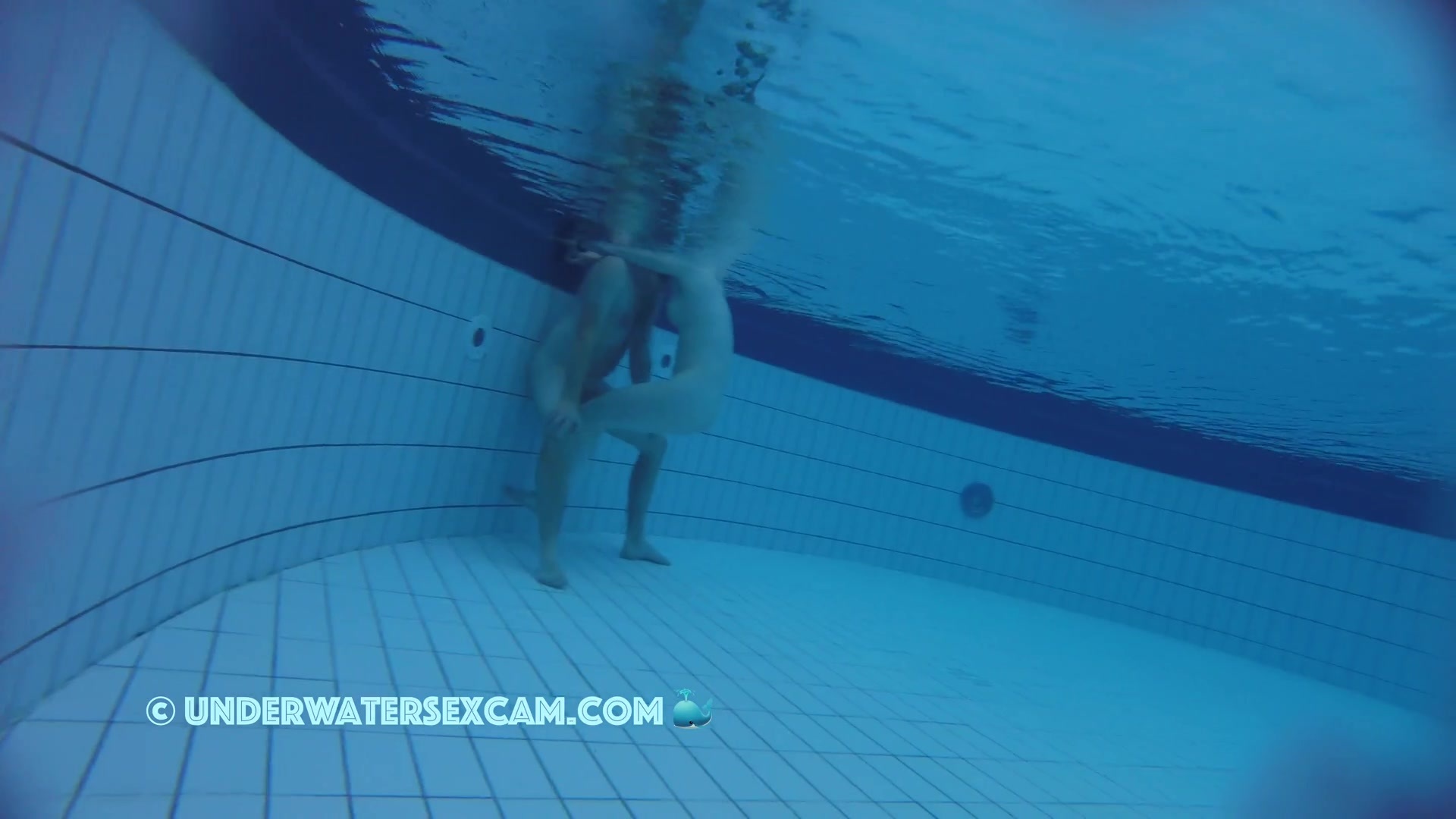 A nice couple in the evening naked in the pool while the hidden security camera is taping them underwater.