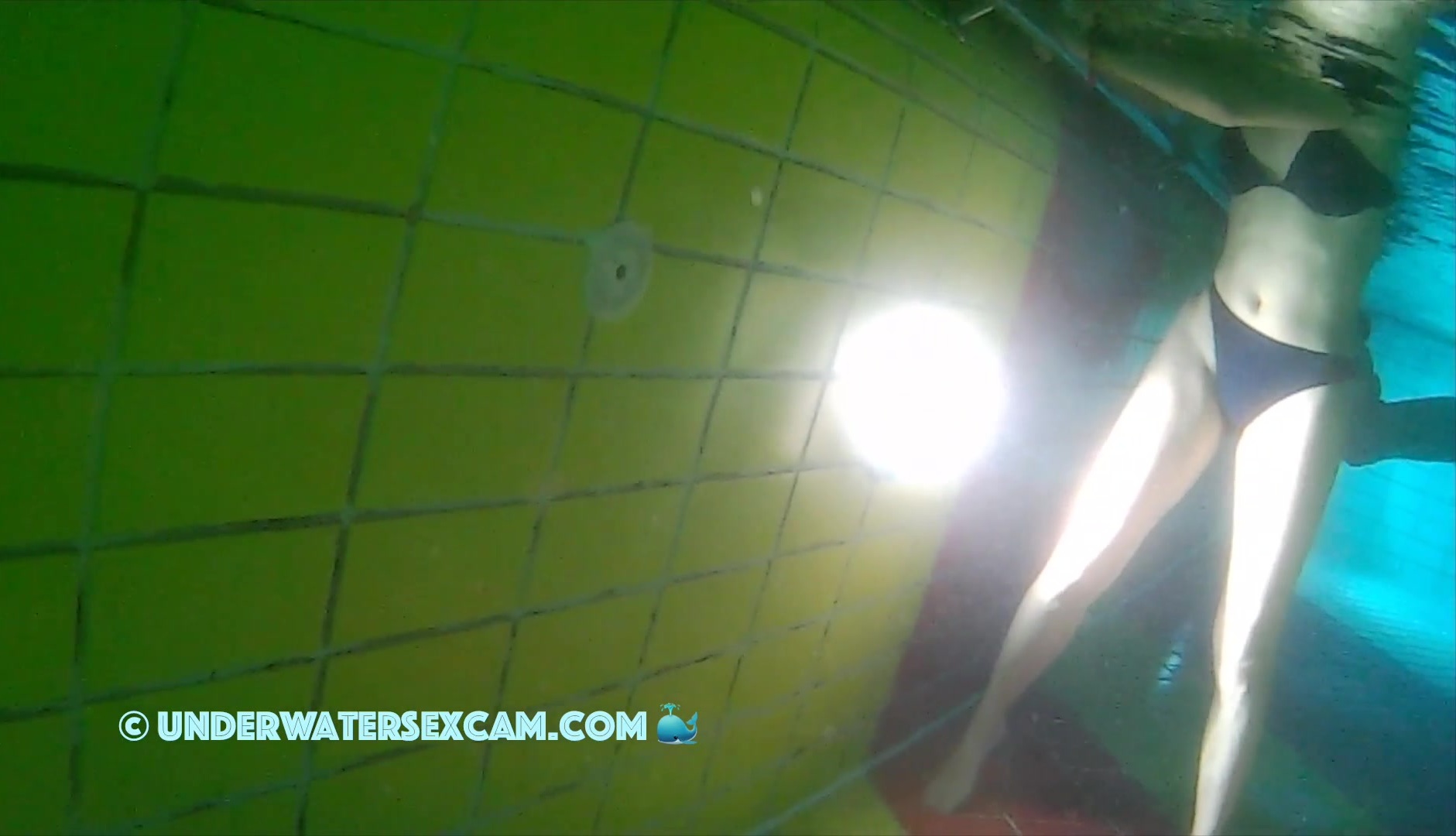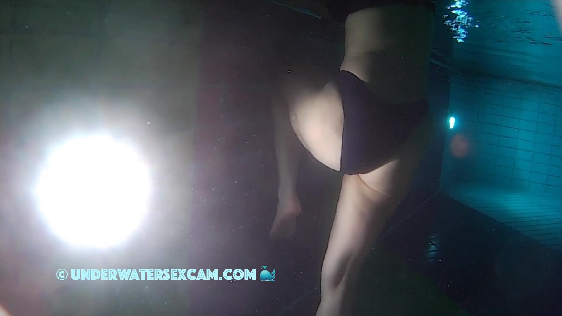 Lady in black bikini uses the underwater jet stream in a public pool and the voyeur is taping her with his hidden camera.