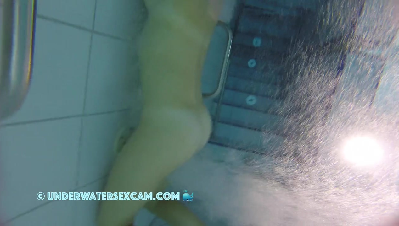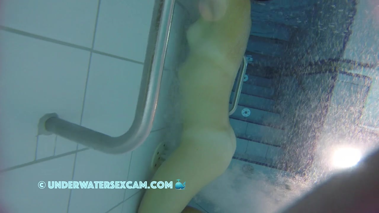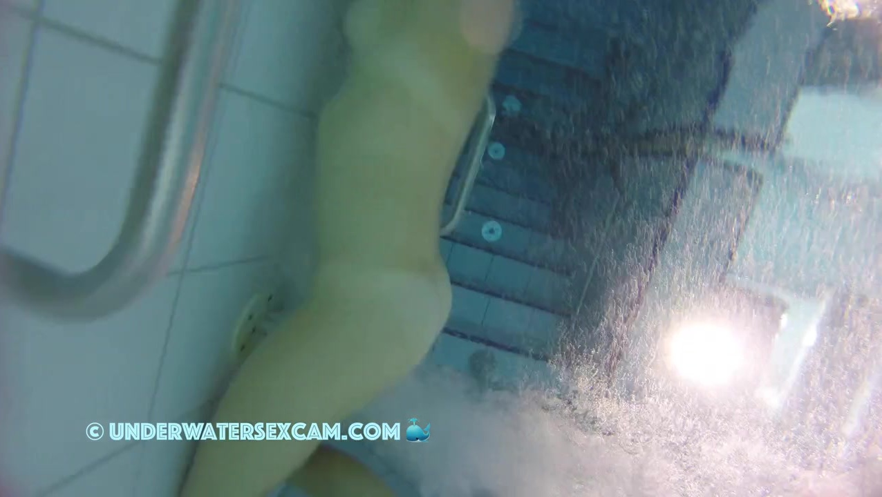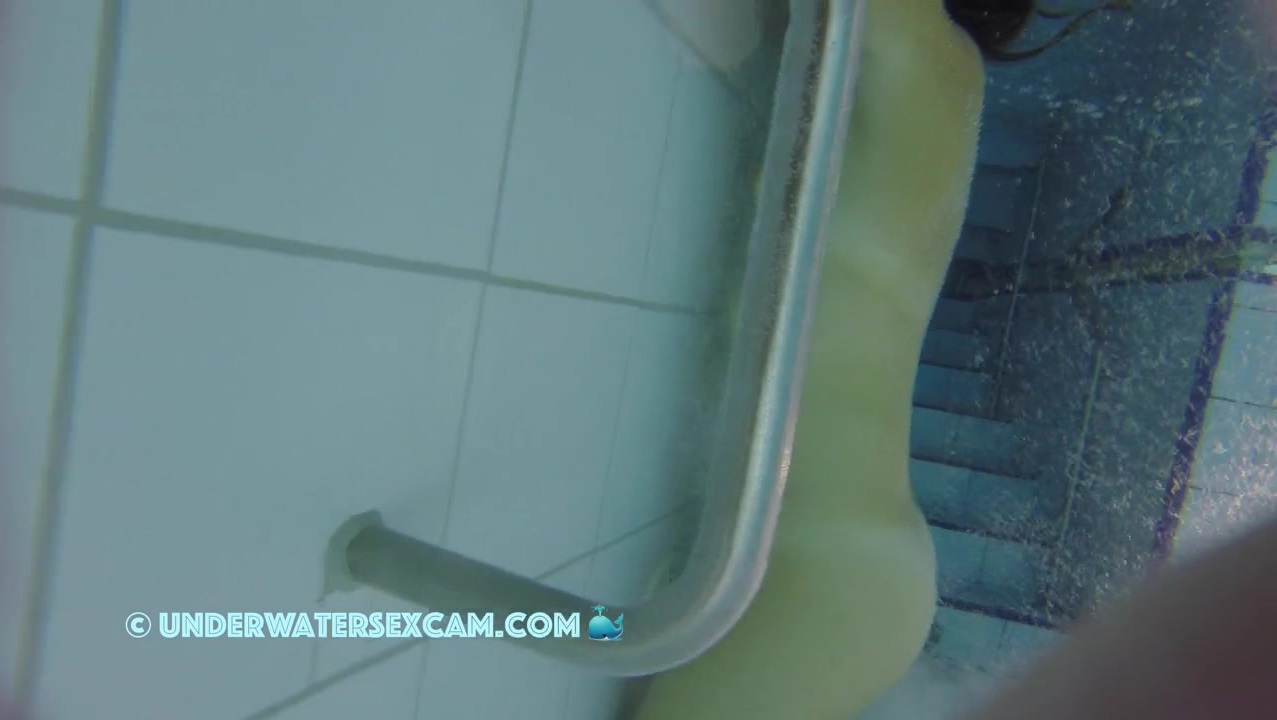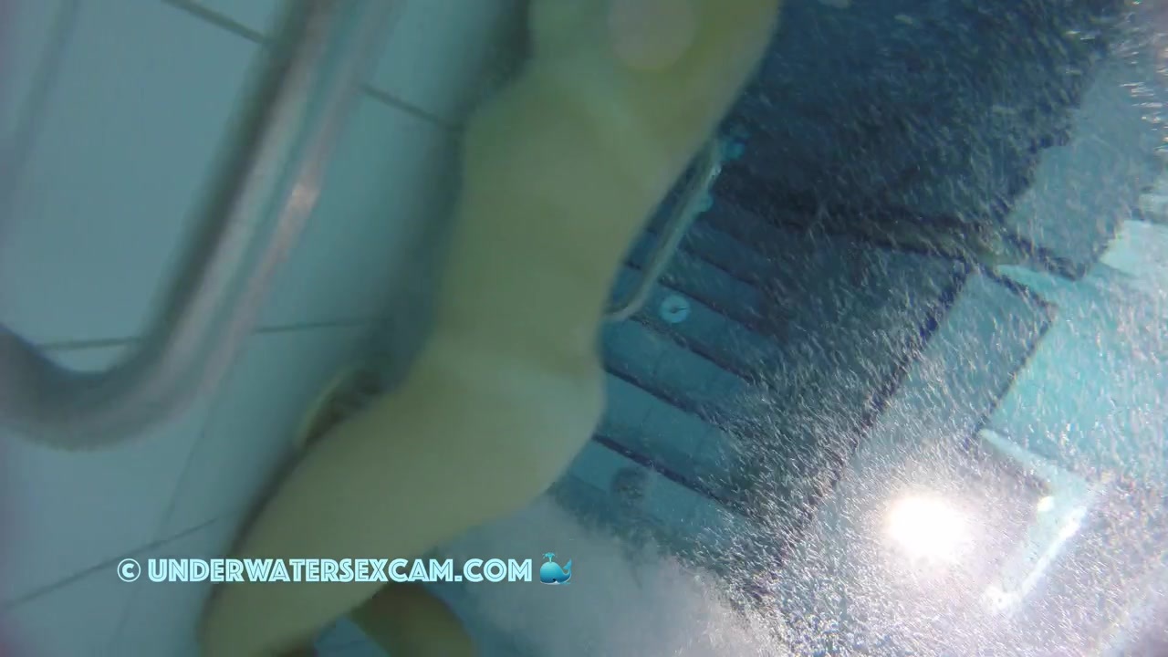 She fucks again without shame with jet stream in a public pool while the voyeur is filming her with his hidden underwater cam.