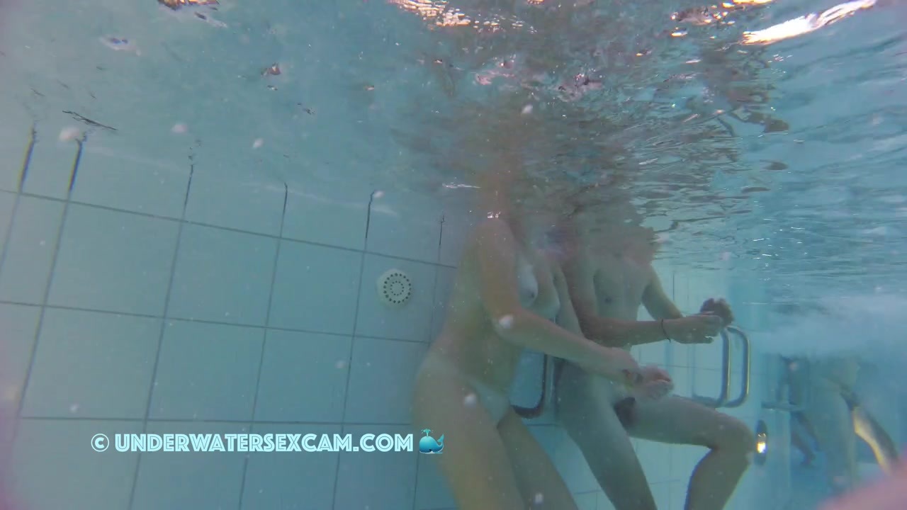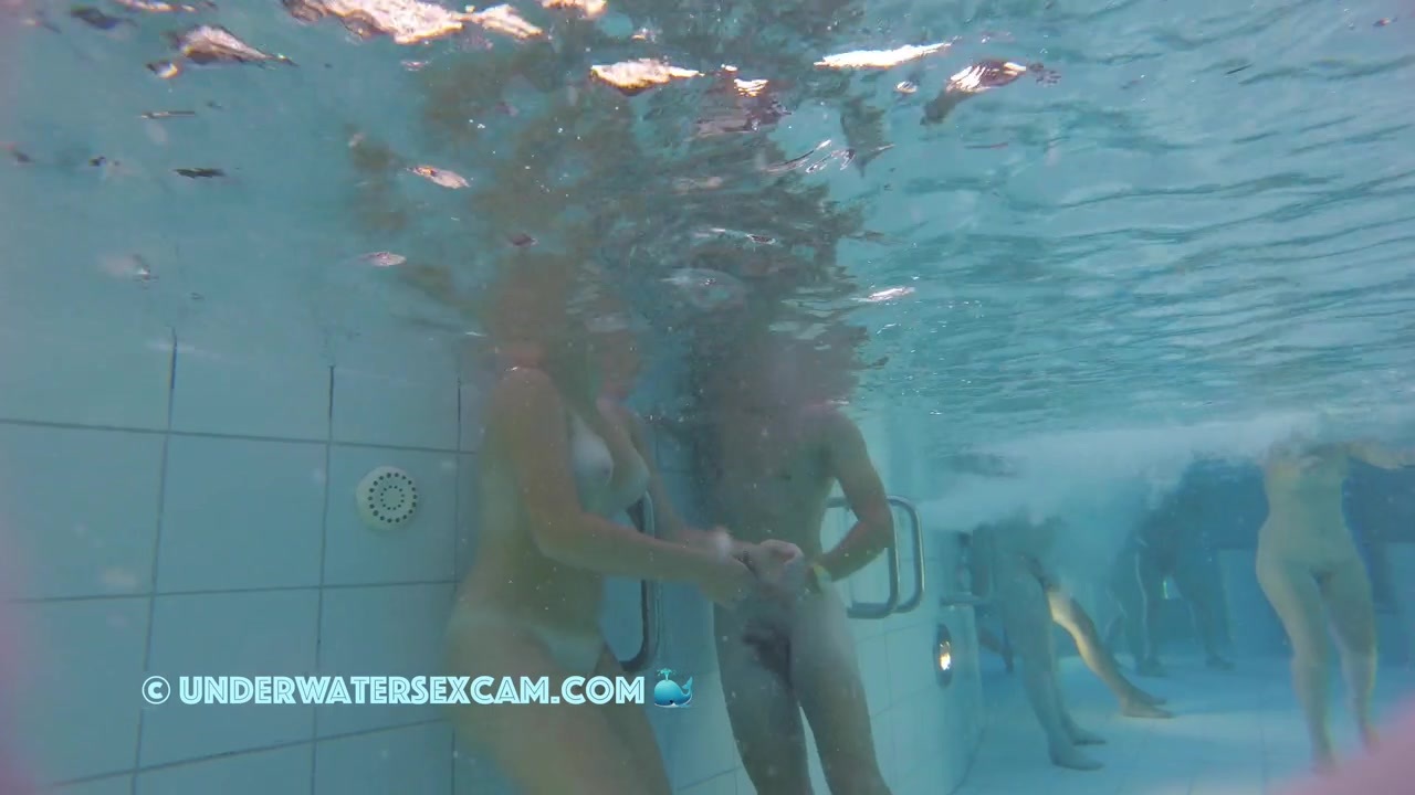 Her tan lines look like a bikini in a public pool while the voyeur is filming her with his hidden underwater spy cam.