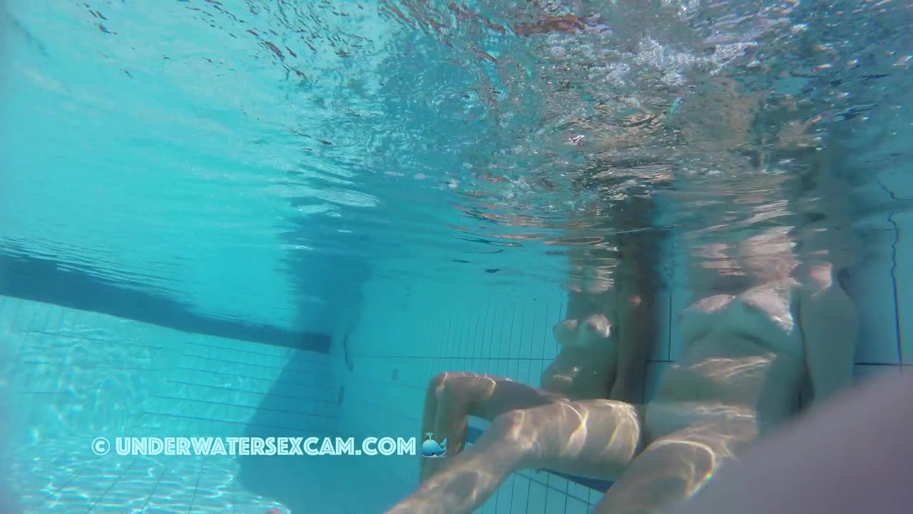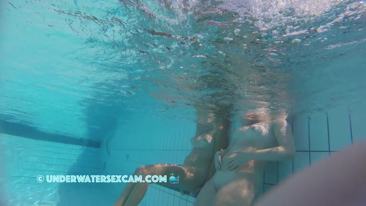 Two mermaids waiting for a nice horny man in a public pool while Peeping Tom is taping them with his hidden underwater cam.