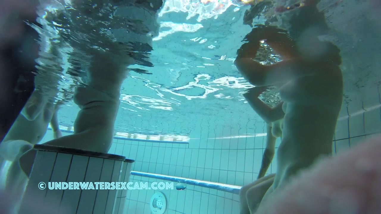 Super cute teen shows herself naked in public while the voyeur is filming her with his hidden underwater camera in the public pool.