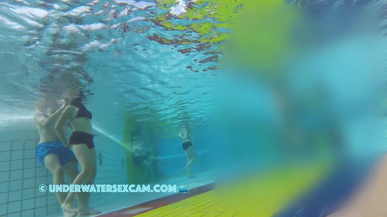 He puts his hands under her swimming trunks and massages her ass underwater in a public pool while the voyeur is recording all with his hidden camera.