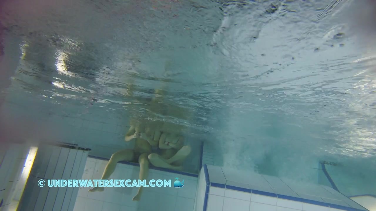 Sporty couple regenerating on an underwater bench while the hidden surveillance camera is recording all in a public sauna pool.