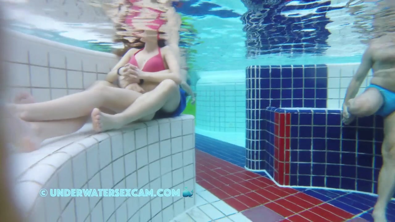 Teen couple is playing together in a public pool while the hidden security cam is taping them underwater.