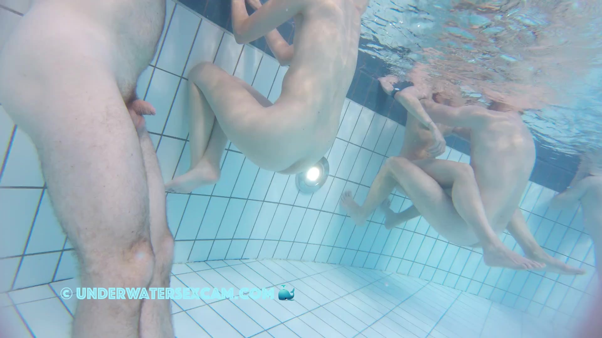 Girl with only nipples and a young couple in the background getting horny while the voyeur is filming them underwater in a public pool with a spy camera.
