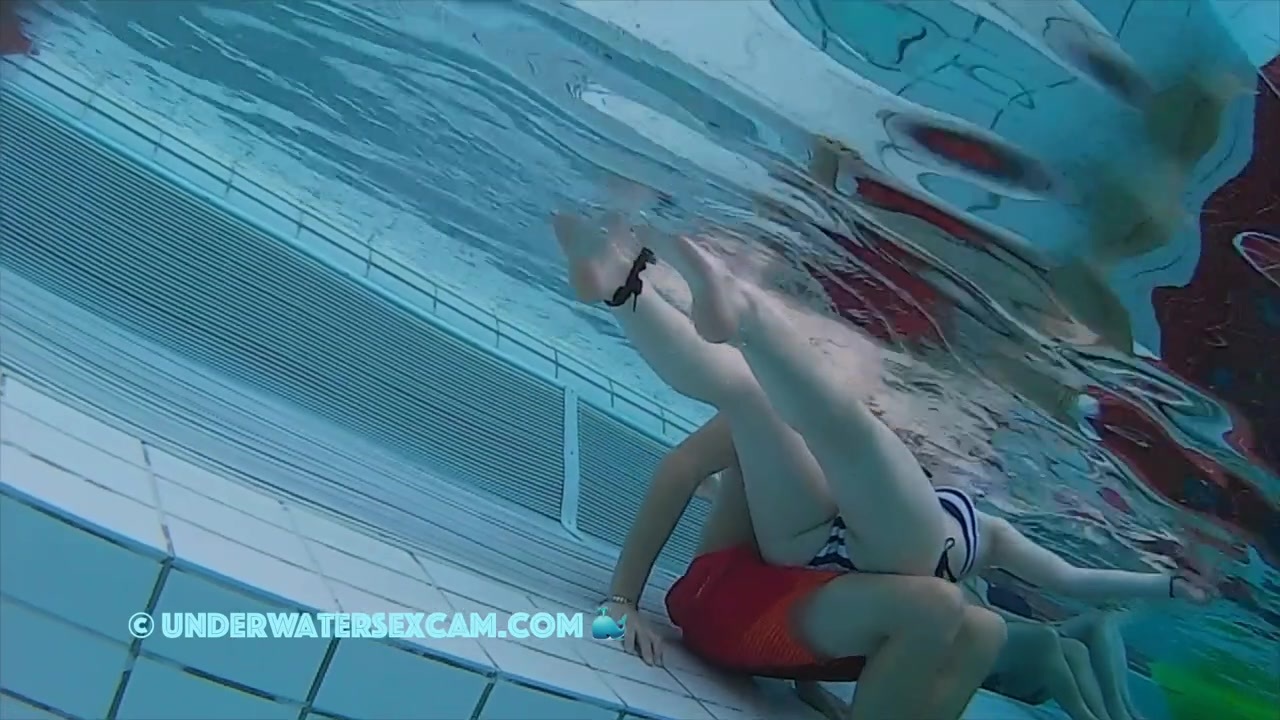 Young teen 18+ couple has some fun in a public pool while the hidden security cam is taping them underwater.