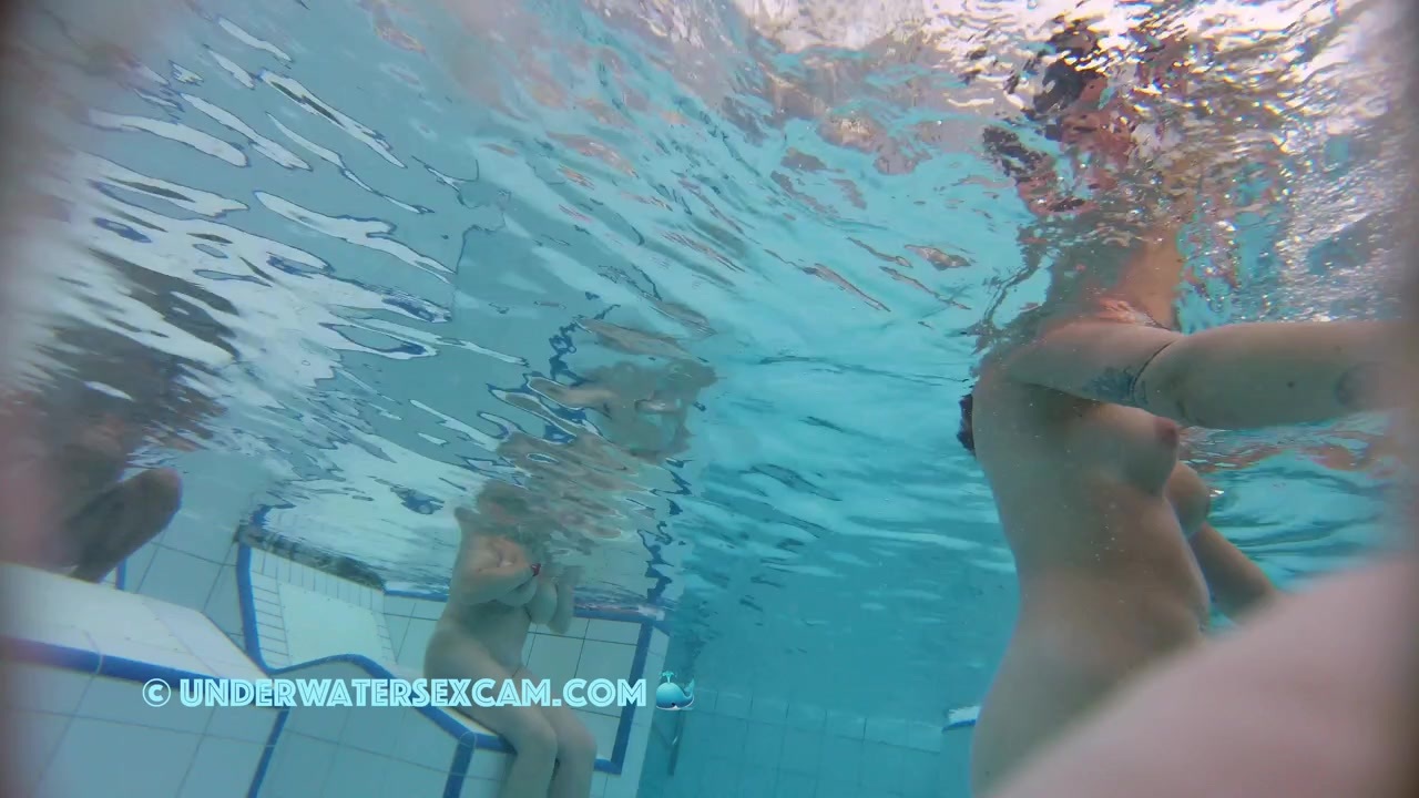 Sexy girl with pierced belly is horny but her boyfriend doesn't understand while the voyeur is filming her with his hidden underwater camera in a public sauna pool.