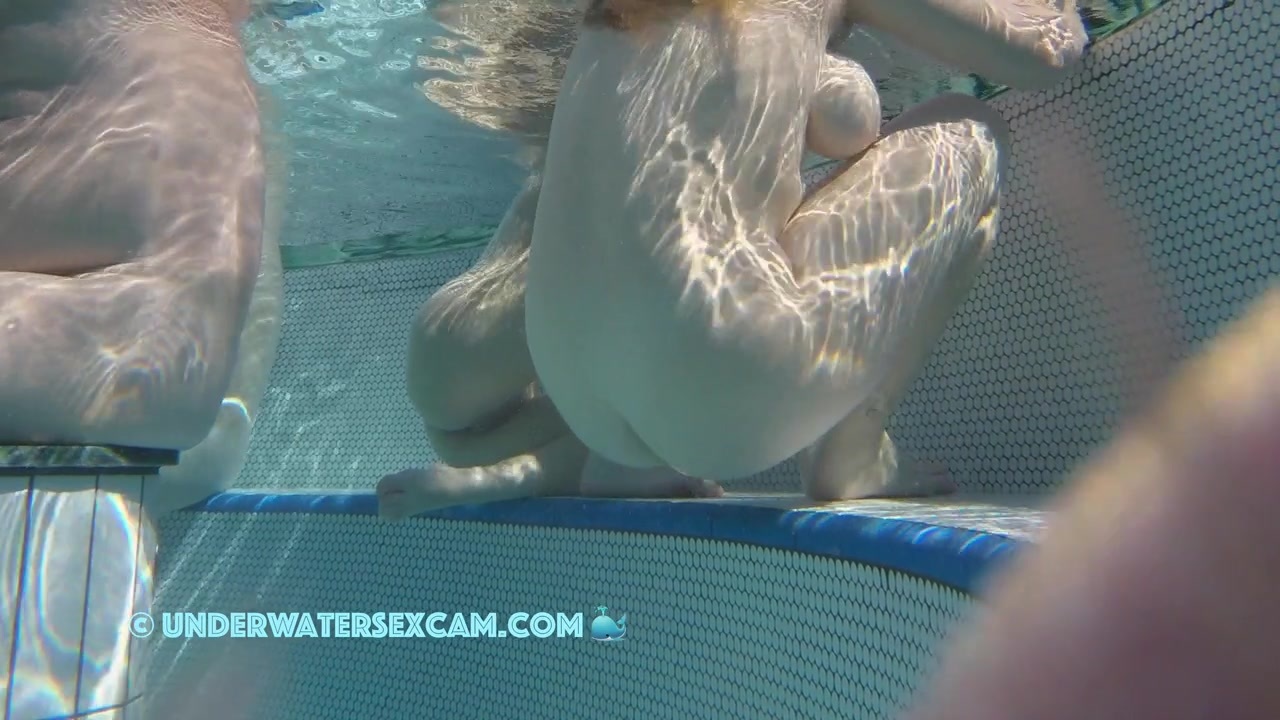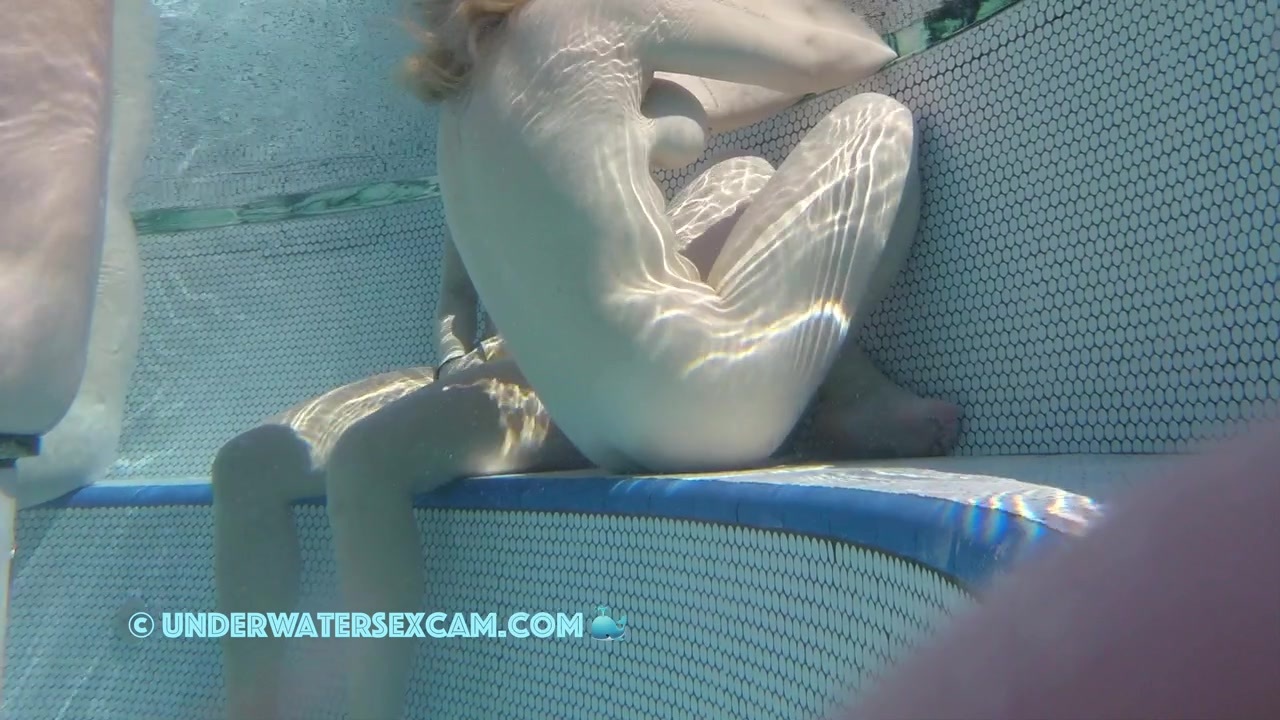 This horny teen starts playing with her pussy because she is watching my hard bare cock meanwhile the hidden surveillance cam is taping her underwater in a public pool.