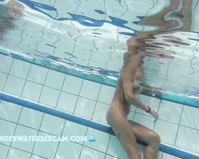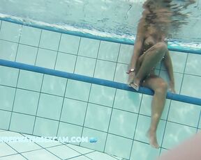 A horny milf shows off her perfectly tanned body and is very proud while the curious voyeur is filming her underwater in a public nudist resort with a spy camera.