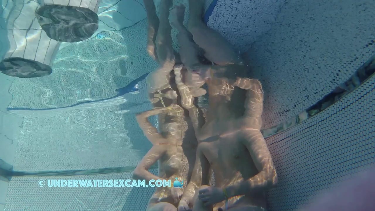 A young couple in love relaxing in the sauna pool while the hidden security camera is taping them underwater in a public nudist resort.